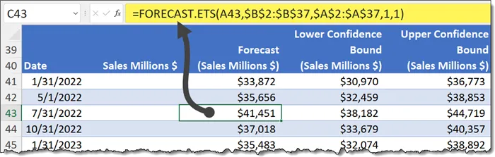 The FORECAST.ETS function uses historical data to predict future values. Here’s a breakdown of how it operates: