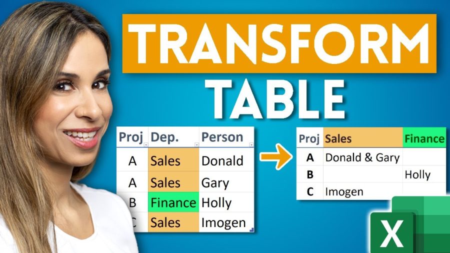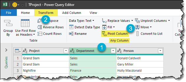 Because we want the list of Departments across the top of the table, we can select the heading for Department and then click Transform (tab) -> Any Column (group) -> Pivot Column.
