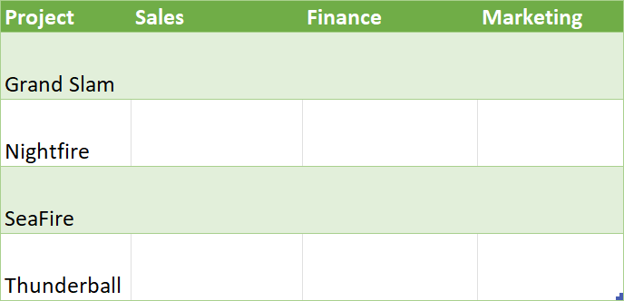 Our objective is to create a two-way table (officially known as a cross-tabular structure); one that lists the Projects to the left and the Departments across the top.
