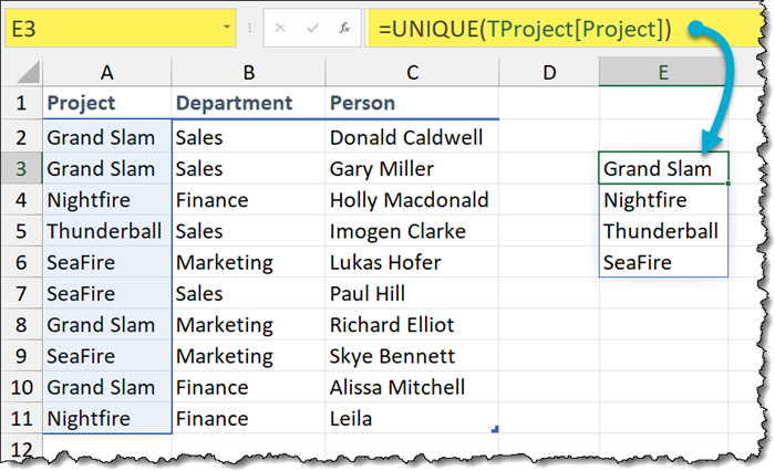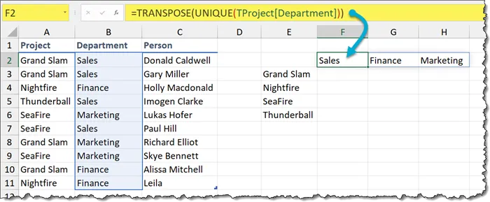 =TRANSPOSE(UNIQUE(TProject[Department]))
