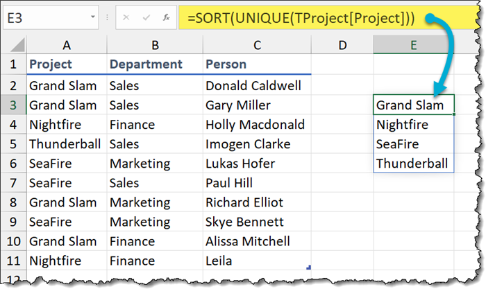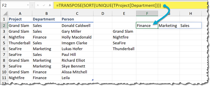 =TRANSPOSE(SORT(UNIQUE(TProject[Department])))