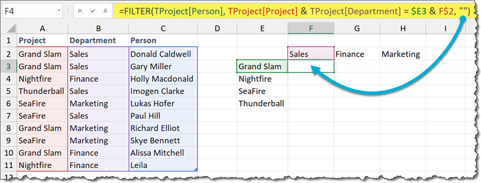 =FILTER(TProject[Person], TProject[Project] & TProject[Department] = E3 & F2, "")Because we wish to fill this formula down and to the right to create an array of results, we need to “fix” or “lock” the references so that one part of the reference can be modified when copied while the other part remains unchanged.