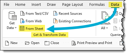 To bring the table of data into Power Query, click anywhere in the data and select Data (tab) -> Get & Transform Data (group) -> From Sheet (formerly labeled as “From Table/Range”).