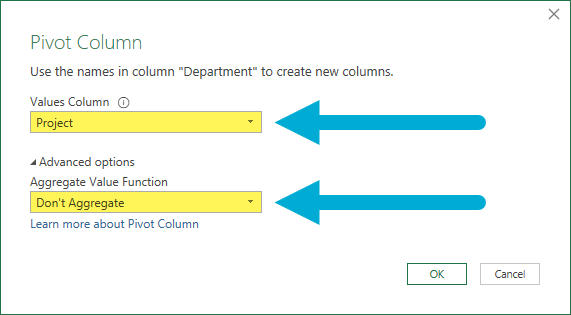 In the Pivot Column dialog box, we select Person as the “Values Column” (the column to be aggregated at each “Project/Department” intersection). Also, expand the “Advanced Options” and set the aggregation method to “Don’t Aggregate” and click OK.