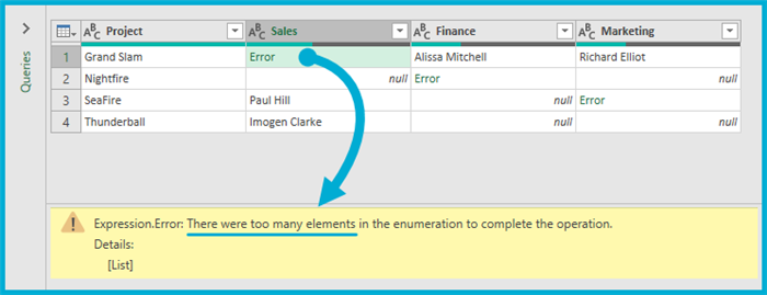 The result is less than optimal. Clicking to the right of one of the ERROR entries, we can see in the Preview Window (bottom of the editor) that Power Query can’t display multiple results in a single cell.