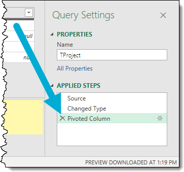 Since Power Query doesn’t have an Undo feature, we can remove the “Pivot Column” step by clicking the “X” to the left of the step listed in the Applied Steps panel.