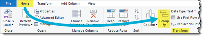 Next, select Home (tab) -> Transform (group) -> Group By.