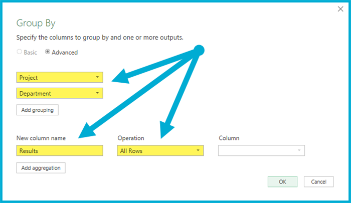 Because we had pre-selected the “Project” and “Department” columns, these columns are pre-configured as columns to group by.
