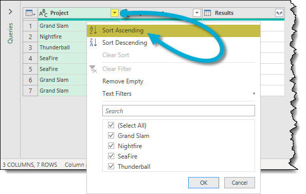 Click the small down-arrow button on the Project column heading and select “Sort Ascending”.