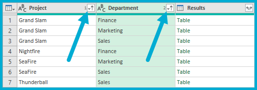 The arrows indicate sort direction (ascending) and the numbers indicate sort order.