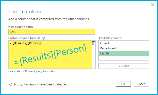 In the Custom Column dialog box, name the new column “Lists” and enter the following formula in the formula field: