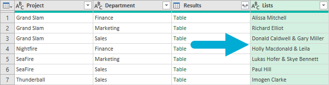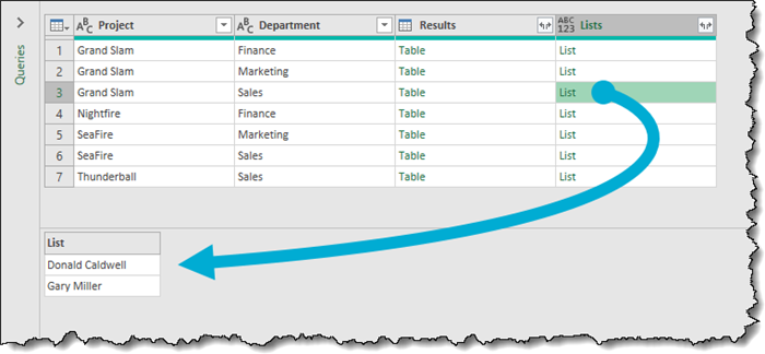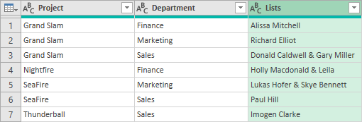 When we click OK, we see a new column with nested lists. Clicking to the right of a List reveals in the Preview Windows the extracted names for that “Project/Department” combination.