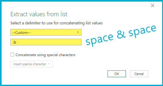 In the “Extract values from list” dialog box, select –Custom– and enter the “space ampersand space” character combination. Click OK when finished.