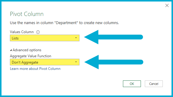 In the Pivot Column dialog box, select “Lists” as the Values Column (the column to be aggregated at each “Project/Department” intersection) and set the aggregation method to “Don’t Aggregate”.