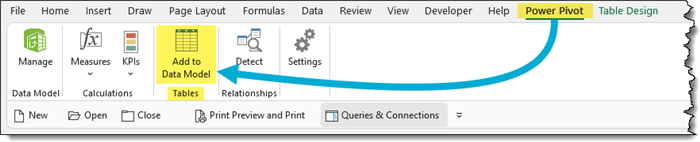 We begin by loading the data into the Power Pivot Data Model. This is done by clicking anywhere in the data and selecting Power Pivot (tab) -> Tables (group) -> Add to Data Model.