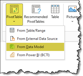 Normally we would click in the data to create a Pivot Table, but since we have loaded the table into the Data Model we will click in the Pivot Table destination call and select Insert (tab) -> Tables (group) -> Pivot Table -> From Data Model.