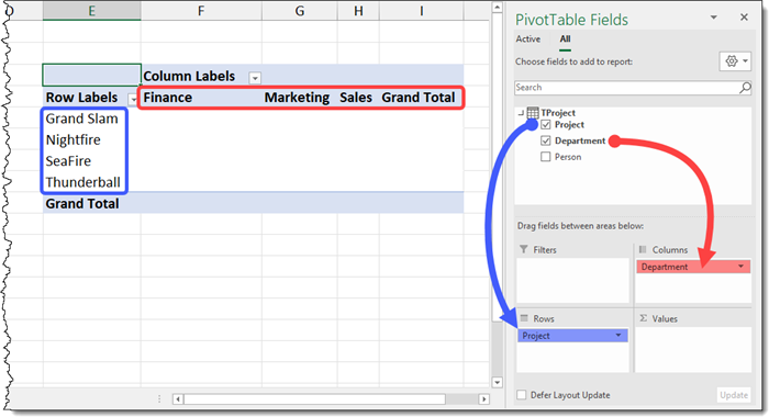 In the PivotTable Fields panel, place Project in the Rows section and Department in the Columns section.