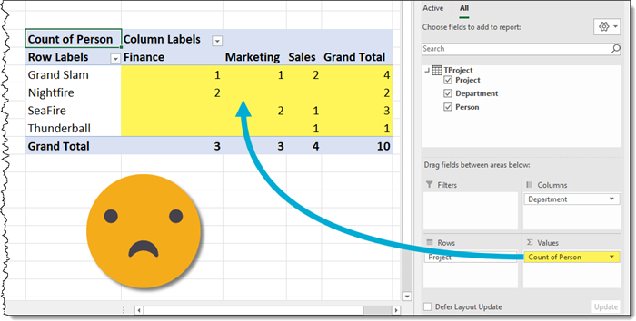 We can’t place Person in the Values field as it will count the number of entries for each “Project/Department” combination.