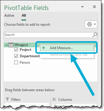 To create a measure in the Data Model that uses CONCATENATEX, right-click on the table name “TProject” in the PivotTable Fields panel and select “Add Measure…”