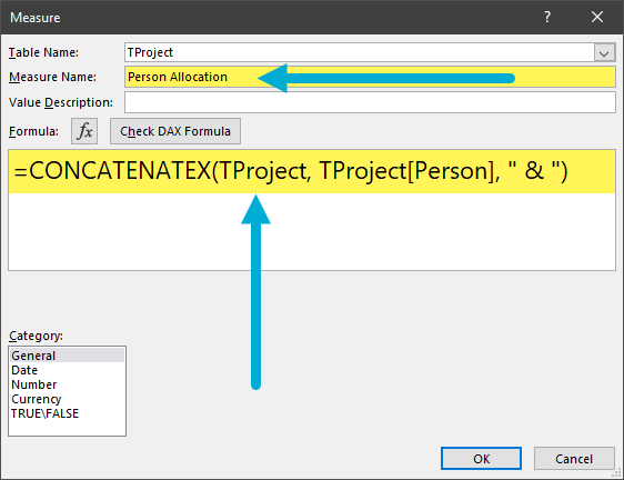 =CONCATENATEX(TProject, TProject[Person], " & ")