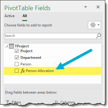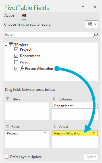 Add the newly created “Person Allocation” measure to the Values field of the Pivot Table.