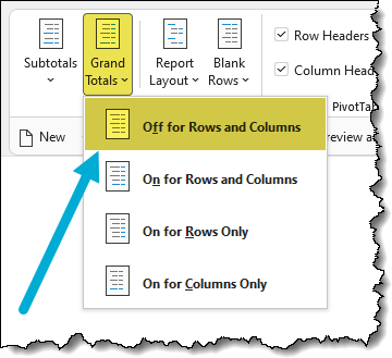 To use the ribbon to suppress the grand totals for the rows and columns, click in the Pivot Table and select Design (tab) -> Layout (group) -> Grand Totals -> Off for Rows and Columns.