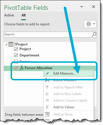 To modify the CONCATENATEX measure, right-click the “Person Allocation” measure and select “Edit Measure…”