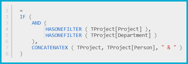 =IF(AND(HASONEFILTER(TProject[Project]), HASONEFILTER(TProject[Department])), CONCATENATEX(TProject, TProject[Person], " & ") )