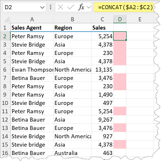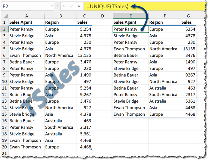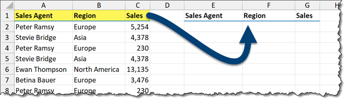 Select the cell directly below the [Sales Agent] heading (in this case, cell E2) and enter the following formula: