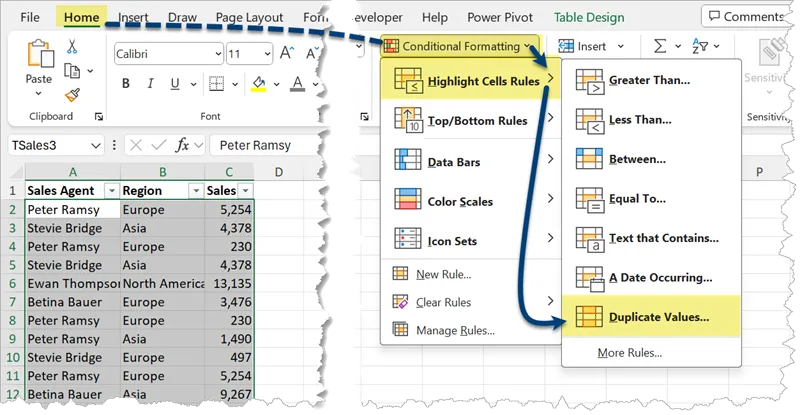 If your data keeps changing and there’s a risk that values will be repeated, you may want to include visual indication that duplicates are present. There are several methods of finding duplicates in Excel. The simplest one is right there on the Home tab – conditional formatting.
