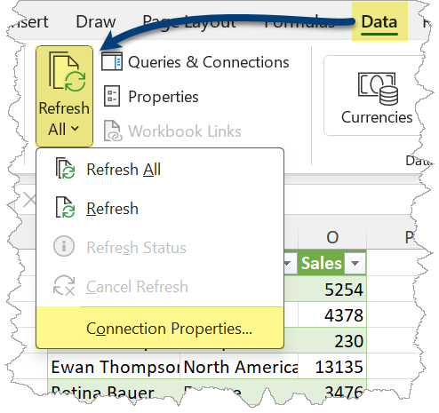 - The user opens the file (see Query Properties image below; you access Query Properties by expanding the Refresh All options and selecting Connection Properties (see above) or right-clicking on the query name in the Queries & Connections pane and selecting Properties).