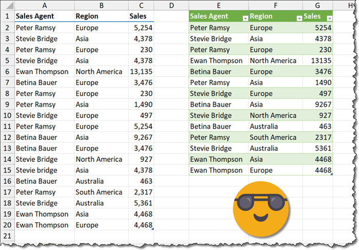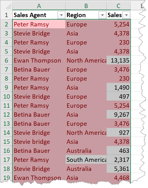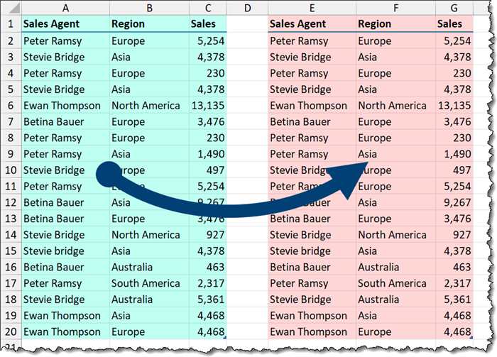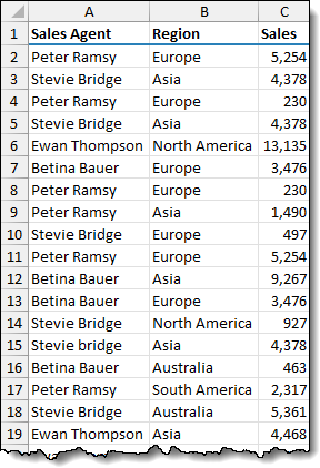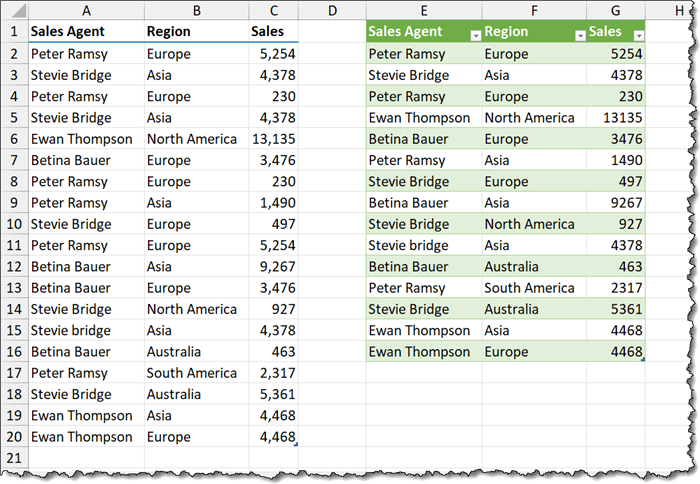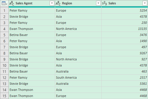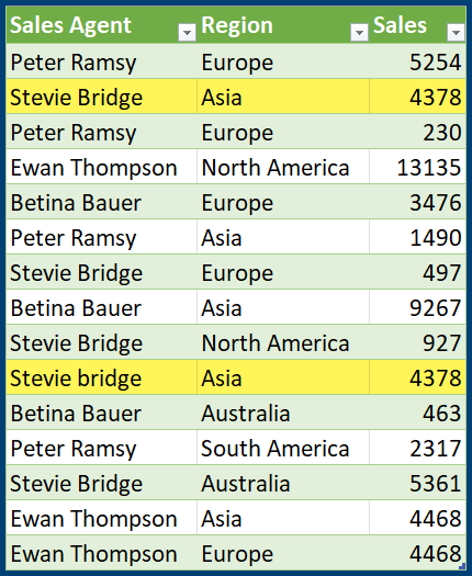 Notice that “Stevie Bridge” in “Asia” with “4378” in [Sales] is listed twice.