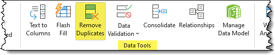 - Select Data (tab) -> Data Tools (group) -> Remove Duplicates.