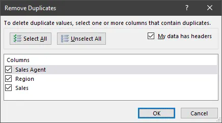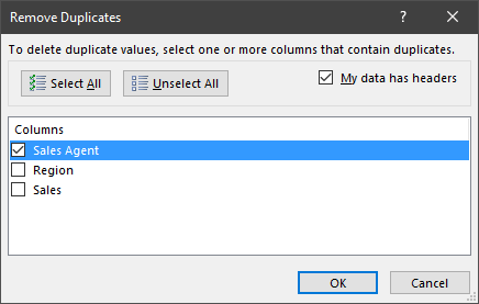If you wanted to remove all duplicated rows of the table based solely on the [Sales Agent] column, you would follow the above process but only check the box for [Sales Agent] in the Remove Duplicates dialog box.
