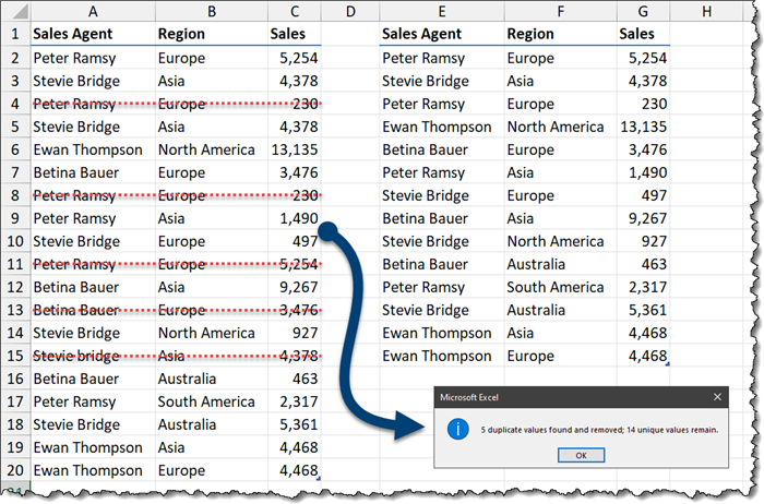 We now have only one “Stevie Bridge” in “Asia” with “4378” in [Sales]. Data successfully deduplicated.