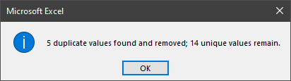 The system reports back how many duplicate values were removed as well as how many unique values remain.