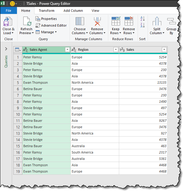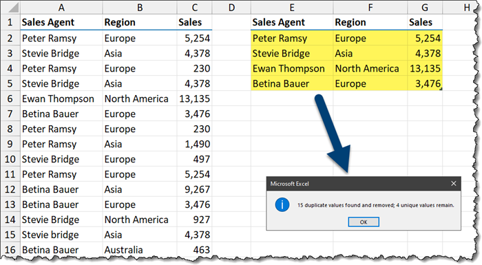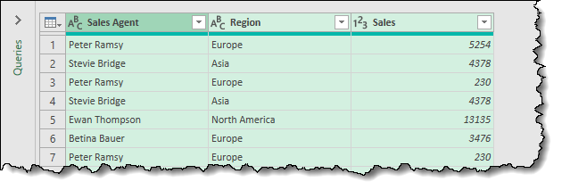 NOTE: Only the row for the first encountered [Sales Agent] name is retained. All rows that follow with the same [Sales Agent] name are removed.
