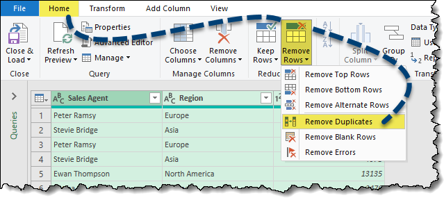 - Select Home (tab) -> Reduce Rows (group) -> Remove Rows -> Remove Duplicates.