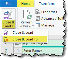 - Load the results of the query back into the Excel spreadsheet by clicking the lower part of the Close & Load button (far left of Home ribbon) and selecting “Close & Load To…”.