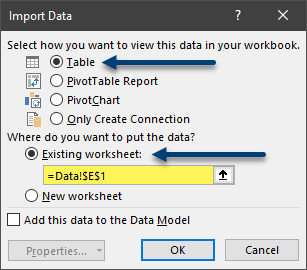- In the Import Data dialog box, select the option for Table and Existing Worksheet. Select a cell beside the original data (e.g., cell E1 of the Data sheet) and click OK.