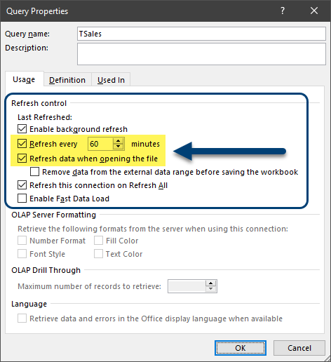- A timer is established to refresh the results every N-minutes (see Query Properties image below).