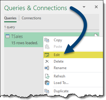 - In the Queries & Connections pane, either double-click the “TSales” query or right-click the “TSales” query and select Edit. This will reopen the Power Query Editor.