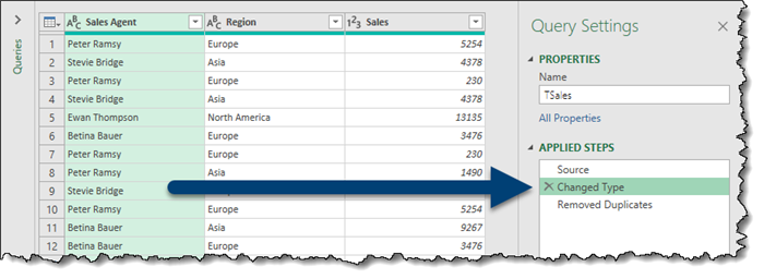 - In the Query Settings pane (on the right) click the step labeled “Changed Type”. If you have more steps in your query, just remember that it should be a step before the “Removed Duplicates” step.