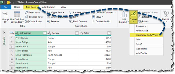- Capitalize the first letter of each word by selecting Transform (tab) -> Text Column (group) -> Format -> Capitalize Each Word.