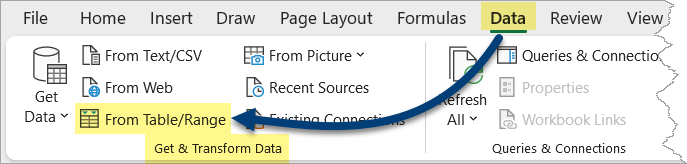 - Select Data (tab) -> Get & Transform (group) -> From Table/Range.