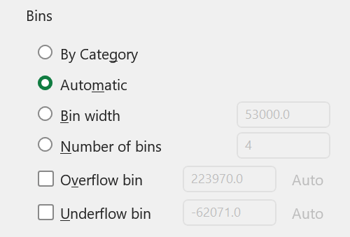 - Overflow Bin: Use this to group all values above a certain number into one bin. Example: If you have sales data and want to group all sales above $10,000 together, set the overflow bin to 10,000.