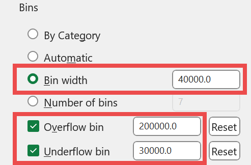 - Bin Width: Setting the bin width to 40,000 will create salary bins in increments of $40,000.