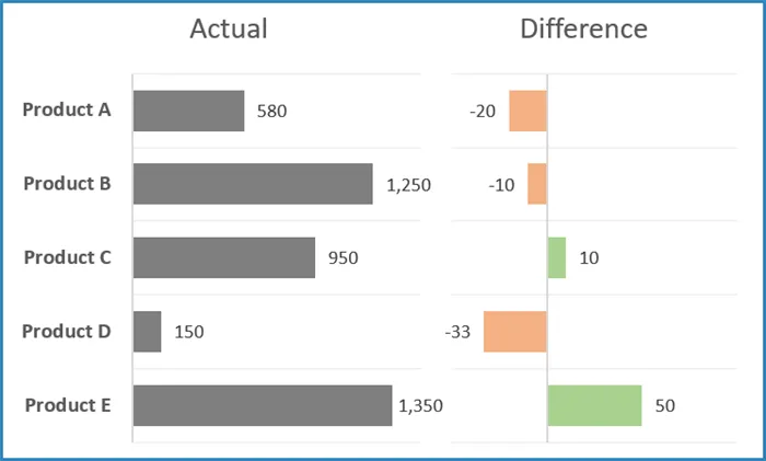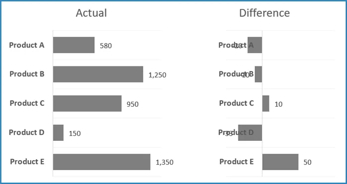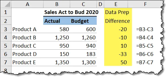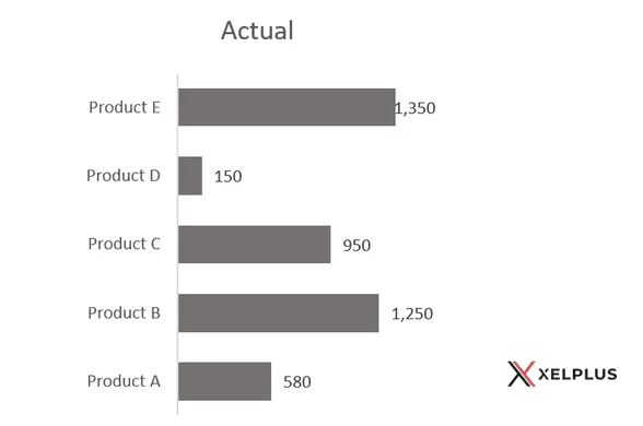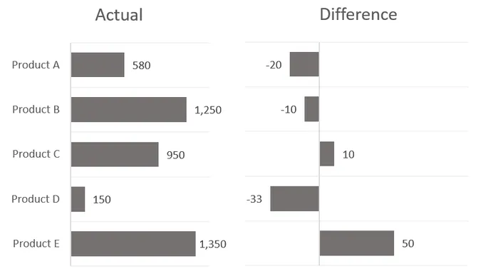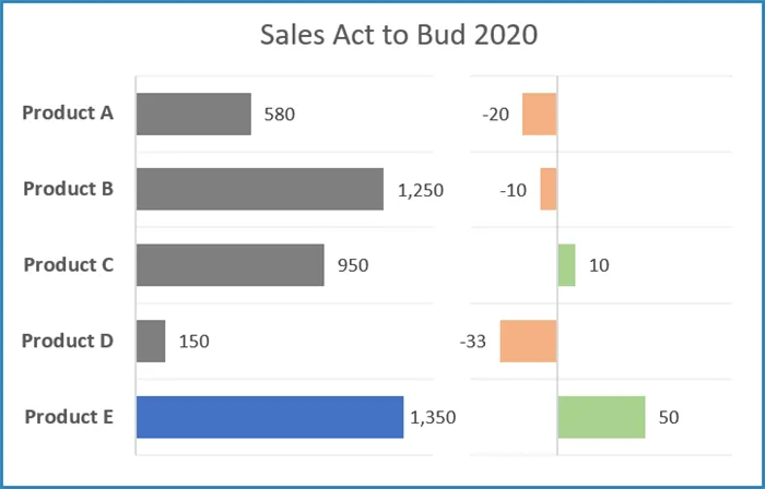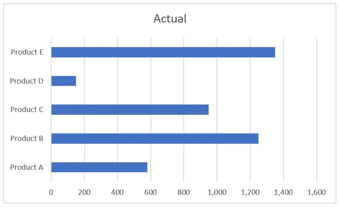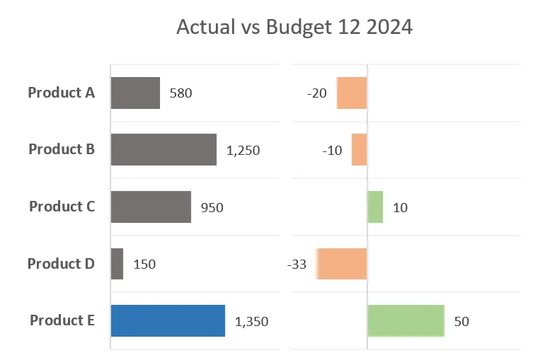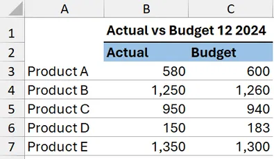 Let’s use an example with Actual vs. Budget data for five products (A through E).
