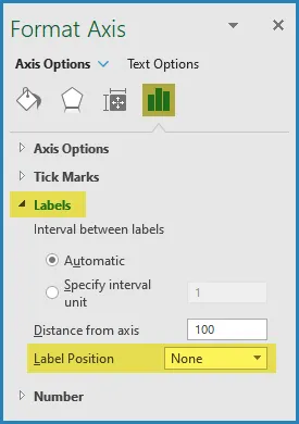 - Go to Format Axis → Axis Options → Labels → Label Position → Select None.