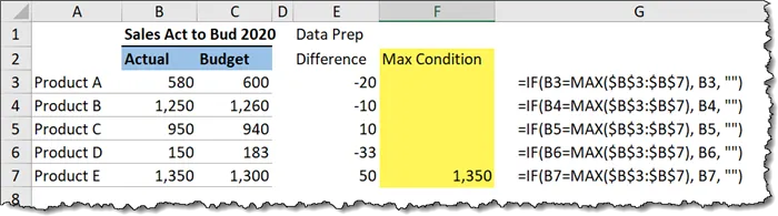 =IF(B3=MAX($B$3:$B$7), B3, “”)- Drag the formula down to cell F7.